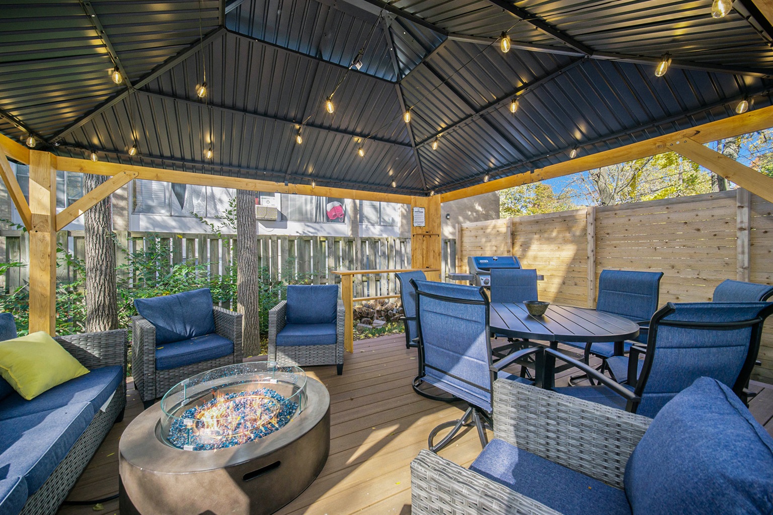 Finally, we arrive in the backyard with luxurious amenities and a lounge seating area, calling you to sit back, relax, and prepare tasty BBQ while the rest of the group enjoys the hot tub and rejuvenates in the sauna.